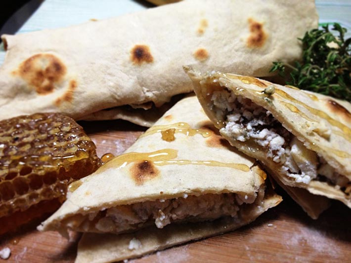 2 xícaras de farinha de trigo ½ colher de sopa de gordura vegetal Pitada de fermento químico em pó 1 colher de chá rasa de sal ½ a ¾ de xícara de água morna 3 figos frescos 100 gramas de queijo gorgonzola 200 gramas de ricota fresca 4 colheres de sopa de mel Tomilho fresco Vamos começar preparando os figos. Pode-se usar a proporção de meio figo para cada tortilha. Corte os figos em seis fatias médias e disponha em um refratário. Por cima, distribua ramos de tomilho fresco e duas colheres de sopa de mel. Reserve. Para fazer seis tortilhas, junte duas xícaras de farinha de trigo. uma colher de chá rasa de sal. e uma pitada generosa de fermento. Misture tudo e depois acrescente meia colher de sopa de gordura vegetal Após misturar bem a gordura na farinha coloque, aos poucos, entre ½ a ¾ de xícara de água morna. A temperatura certa da água morna é mais para frio do que para quente. A massa deve desgrudar fácil da mão sem nem precisar sovar muito. É bem rápido. Se estiver grudando, a quantidade de água utilizada foi maior que a necessária. Acerte com mais farinha. Divida a massa em seis partes e, com um rolo, abra em discos. Faça o mais fino que puder, sem quebrar a massa. Como tem fermento, ela vai adquirir uma espessura maior depois. Enquanto você vai abrindo os discos, pré-aqueça uma frigideira em fogo médio alto e vá colocando, um a um, os que já estão prontos. Depois de cozinhar um lado por mais ou menos um minuto, vire e cozinhe o lado oposto. Quando a tortilha começar a  formar bolhas de ar, aperte suavemente para liberar o ar. Não aperte muito. Esmigalhe 200 gramas de ricota fresca e recheie a tortilha. Pique em cubos pequenos 100 gramas de queijo gorgonzola e coloque por cima da ricota. Por último, depois de retirar do forno, coloque as fatias de figo (assado em forno em 240oC e leve o figo para assar por 7 a 10 minutos) na tortilha, acrescente tomilho debulhado e regue com um pouco das duas colheres de sopa de mel restante. Enrole e repita o processo até acabar todas. Sirva ainda morno, com mais mel se quiser.