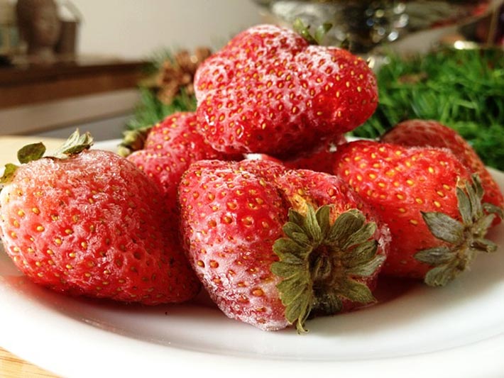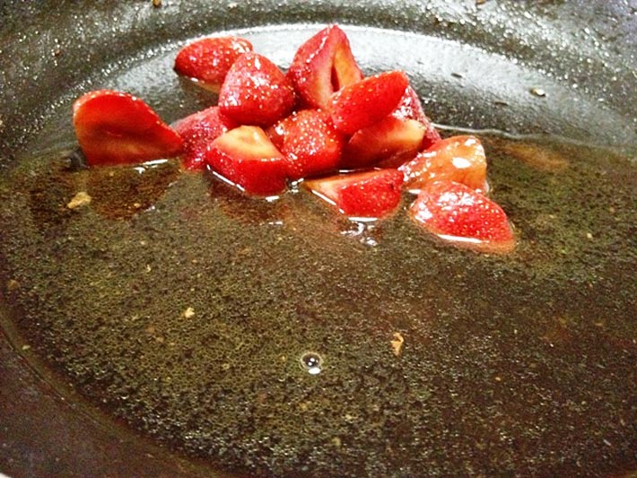 Continuando o molho, em fogo médio, acrescente o caldo de legumes na frigideira – essa técnica de dissolver o resíduo de carnes ou legumes em líquido é conhecida como deglaçar. Deixe ferver e acrescente a mistura feita com os morangos. Abaixe o fogo e deixe engrossar. Tempere com sal e pimenta se preferir. Corte a carne e distribua o molho por cima. Se quiser, use manjericão. Sirva com uma salada de folhas verdes, aproveitando o molho para a salada. Acompanhe com batatas rústicas, assadas ou purê.