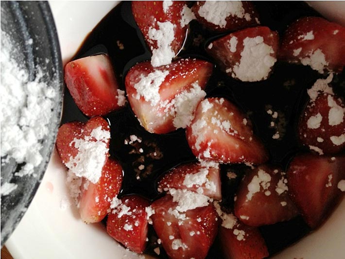 Pré-aqueça o forno a 200°C. Começaremos deixando o morango marinando para fazer o molho que acompanhará a carne. Corte-os ao meio e misture 1/4 de xícara, cerca de 60ml, de aceto balsâmico e duas colheres de chá de açúcar de confeiteiro.