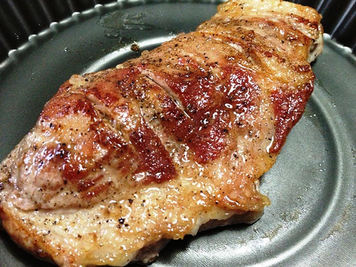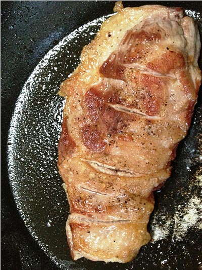 Depois de selar um lado, entre cinco a sete minutos, em fogo médio alto, vire e faça o mesmo do outro lado. Após isso, transfira para o forno. Passados dez minutos, retire. Transfira para um prato e cubra com papel alumínio, lado fosco para fora. Deixe descansar por cinco minutos.