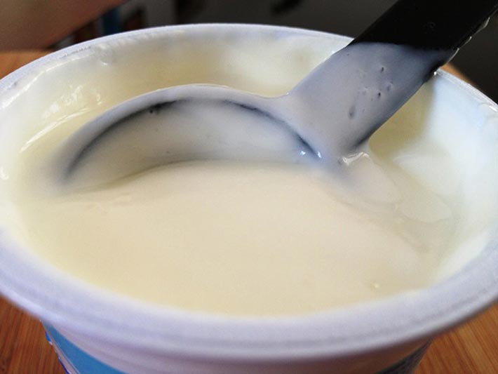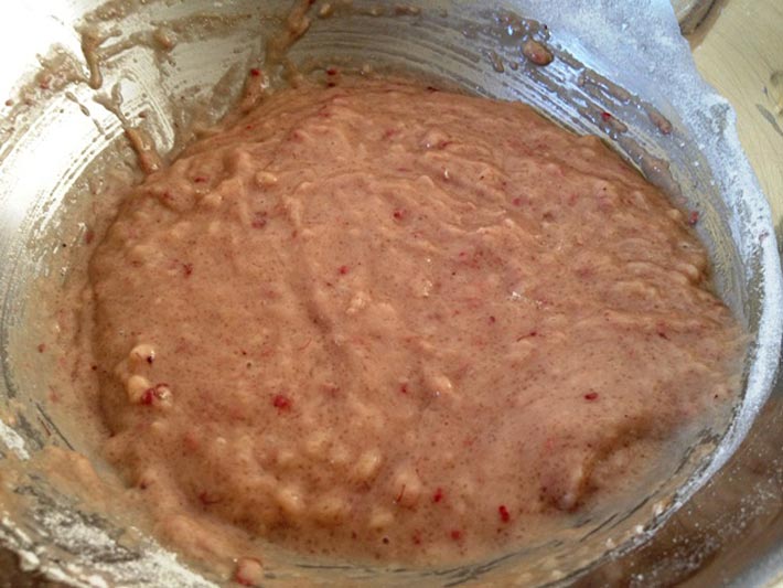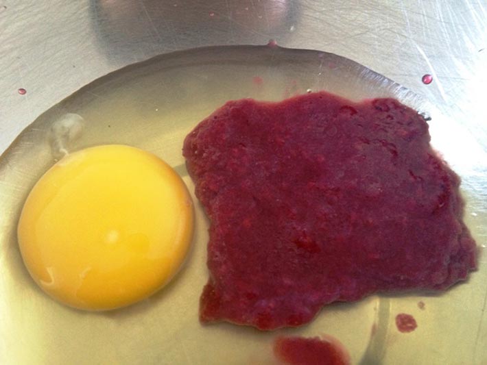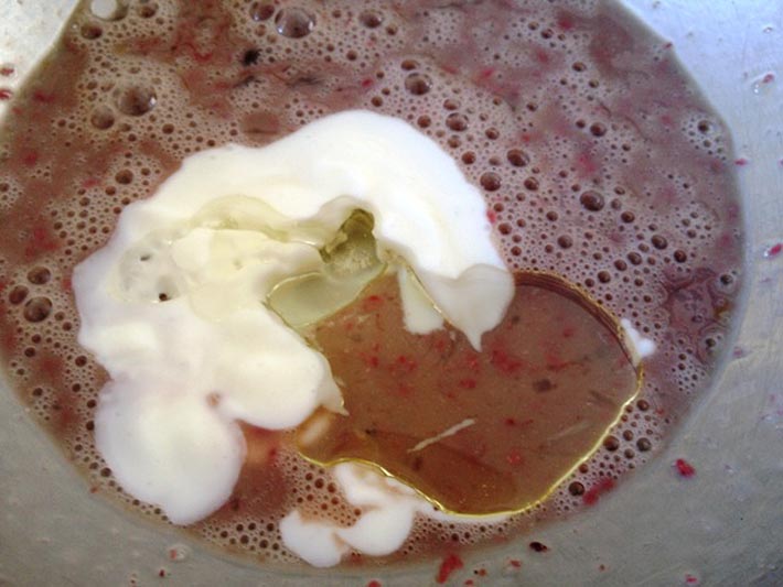 Em uma tigela, misture dois ovos em temperatura ambiente e o purê de framboesa. Acrescente três colheres de sopa de iogurte natural e duas de óleo. Por último, 1/2 de colher de chá de fermento químico em pó, ¼ de colher de chá de essência de baunilha, seis colheres de sopa de açúcar e oito colheres de sopa de farinha de trigo.
