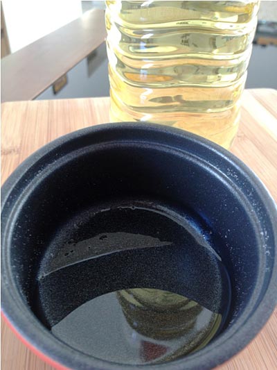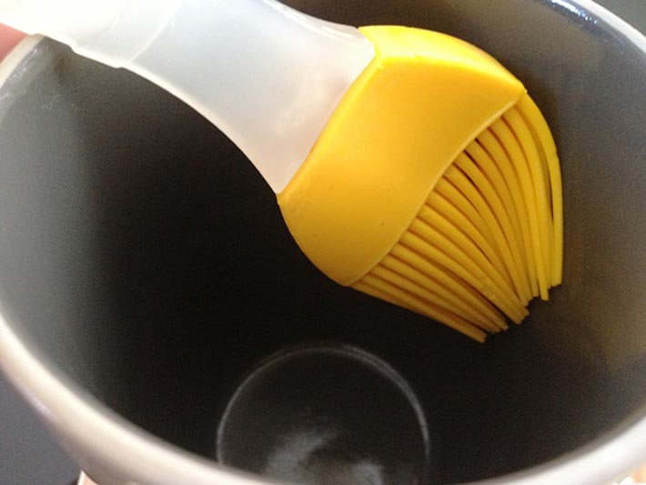 Pincele um pouco de óleo ou manteiga em quatro canecas de café, resistentes ao microondas.