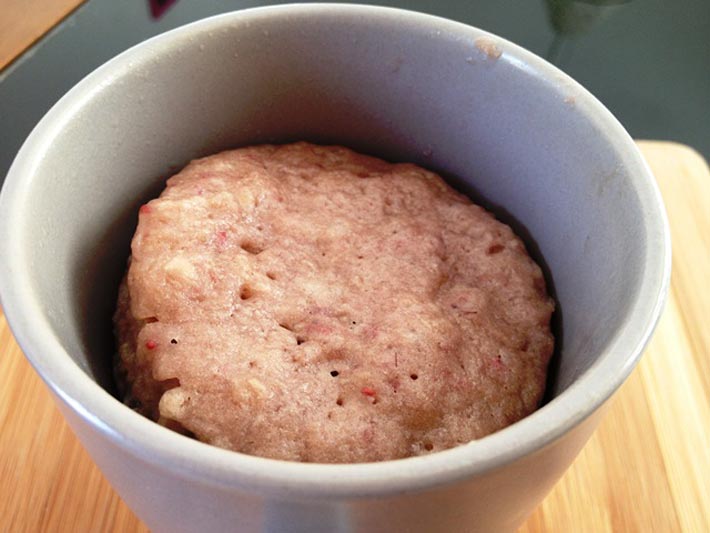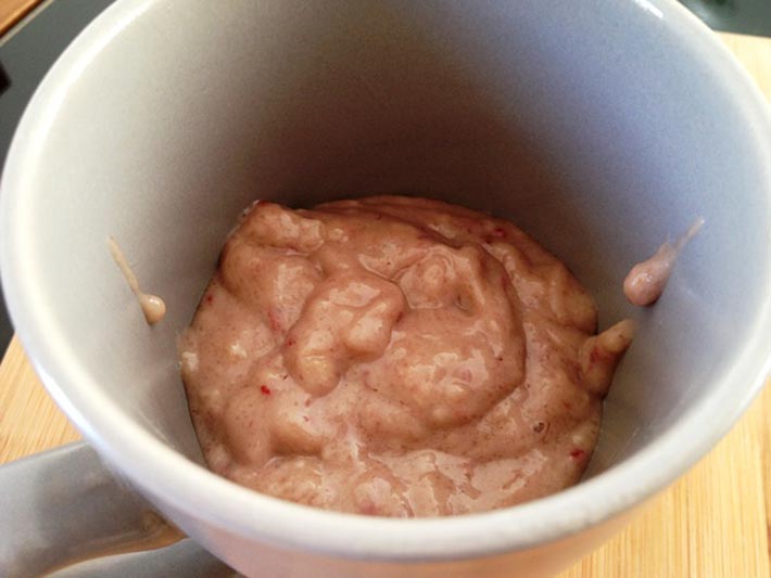 Misture até incorporar bem todos os ingredientes. Em seguida, preencha metade da xícara com a massa - não mais que três dedos de altura - e leve ao microondas, de três a quatro minutos.