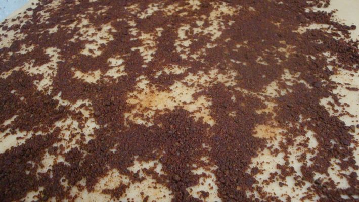 Abra a massa em um quadrado grande – para ficar com 1 cm de espessura, a massa vai abrir uns 60 cm. Espalhe a pasta de canela e aperte, sem muita força, para grudá-la à massa. Agora, pegue uma das extremidades e vá enrolando até fazer um rolo.