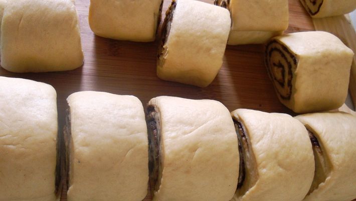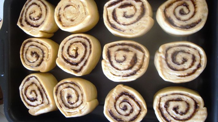 Corte em 12 pedaços. Coloque em um tabuleiro, levemente untado, cubra e deixe crescer novamente. Agora por 30 minutos. Pré-aqueça o forno a 200°C. Asse por aproximadamente 25 minutos, até que esteja bem dourado. Se a parte de cima estiver levemente dourada, pode ser que por dentro ainda esteja cru. Tire do forno e deixe esfriar um pouco. Este rolinho é melhor servido no dia em que é feito, quentinho ainda e com um pouco de creme.
