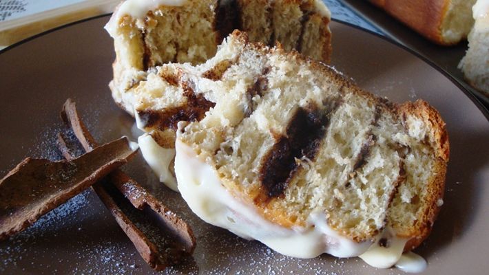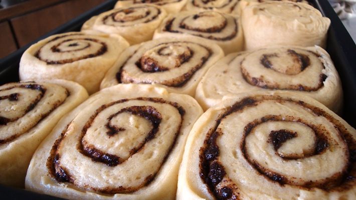 1 xícara de leite morno; 1 pacote de fermento biológico seco instantâneo (10g); 2 ovos; 2/3 xícara de manteiga; 4 1/2 xícaras de farinha de trigo; 1 colher de chá de sal; 1/3 xícara de açúcar ; ¾ xícara de açucar mascavo; 3 colheres de sopa de canela em pó; Para fazer a massa, comece preparando o fermento. Deixe um pacote de fermento biológico seco instantâneo descansar por cinco minutos, em uma xícara de leite morno. Em uma tigela grande, misture 1/3 de xícara de manteiga derretida, dois ovos em temperatura ambiente, uma colher de chá de sal e 1/3 de xícara de açúcar. Acrescente o fermento dissolvido. Bata até misturar tudo. Com o gancho de massa da batedeira, coloque 4 xícaras e meia de farinha de trigo, raspando as laterais da tigela ocasionalmente. Sove entre 5 e 10 minutos até que a massa fique lisa e elástica. Em seguida, transfira para uma superfície levemente enfarinhada e sove à mão durante três minutos. Faça uma bola com a massa e leve novamente para a tigela, untada com um pouco de óleo. Cubra e deixe fermentar por 45 minutos ou até dobrar de tamanho. Para o recheio de canela, é só misturar ¾ xícara de açúcar mascavo, três colheres de sopa de canela em pó e 1/3 de xícara de manteiga. Reserve. Abra a massa em um quadrado grande – para ficar com 1 cm de espessura, a massa vai abrir uns 60 cm. Espalhe a pasta de canela e aperte, sem muita força, para grudá-la à massa. Agora, pegue uma das extremidades e vá enrolando até fazer um rolo. Corte em 12 pedaços. Coloque em um tabuleiro, levemente untado, cubra e deixe crescer novamente. Agora por 30 minutos. Pré-aqueça o forno a 200°C. Asse por aproximadamente 25 minutos, até que esteja bem dourado. Se a parte de cima estiver levemente dourada, pode ser que por dentro ainda esteja cru. Tire do forno e deixe esfriar um pouco. Este rolinho é melhor servido no dia em que é feito, quentinho ainda e com um pouco de creme.