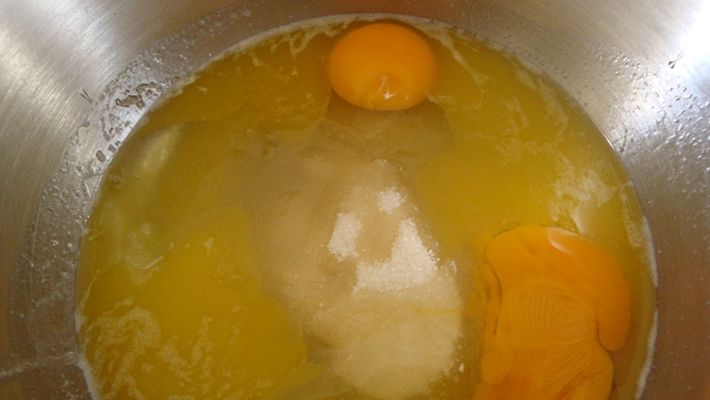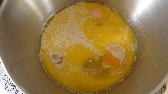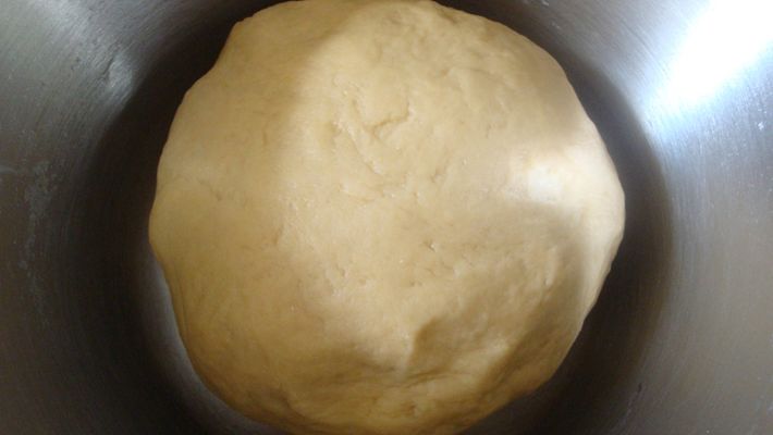 Para fazer a massa, comece preparando o fermento. Deixe um pacote de fermento biológico seco instantâneo descansar por cinco minutos, em uma xícara de leite morno. Em uma tigela grande, misture 1/3 de xícara de manteiga derretida, dois ovos em temperatura ambiente, uma colher de chá de sal e 1/3 de xícara de açúcar. Acrescente o fermento dissolvido e bata até misturar tudo.