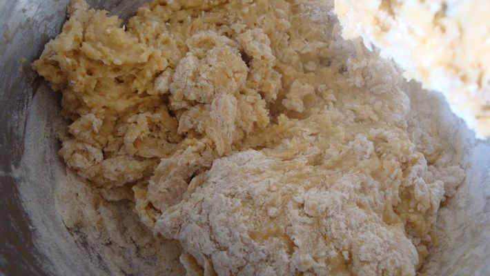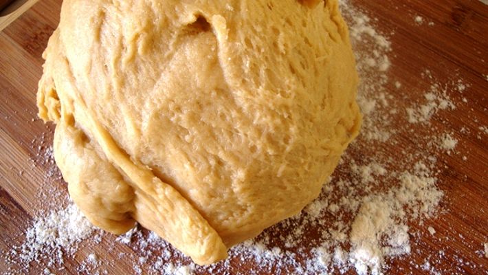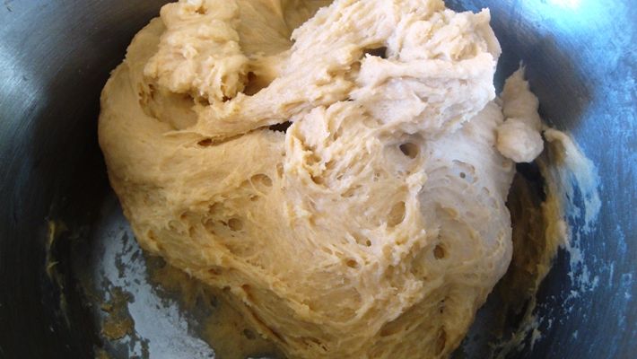 Com o gancho de massa da batedeira, coloque 4 xícaras e meia de farinha de trigo, raspando as laterais da tigela ocasionalmente. Sove entre 5 e 10 minutos até que a massa fique lisa e elástica. Em seguida, transfira para uma superfície levemente enfarinhada e sove à mão durante três minutos. Faça uma bola com a massa e leve novamente para a tigela, untada com um pouco de óleo. Cubra e deixe fermentar por 45 minutos ou até dobrar de tamanho.