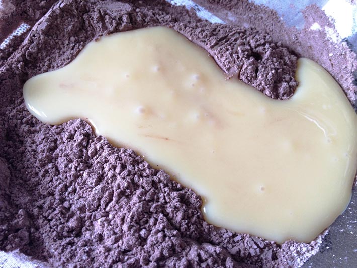 Misture uma xícara de cacau em pó com três xícaras de açúcar de confeiteiro. Coloque uma lata de leite condensado e misture bem. No começo fica um pouco grudento, mas não demora muito para alcançar a textura de trufa.