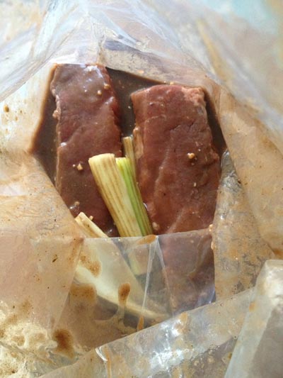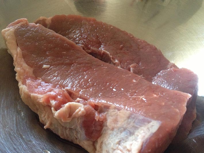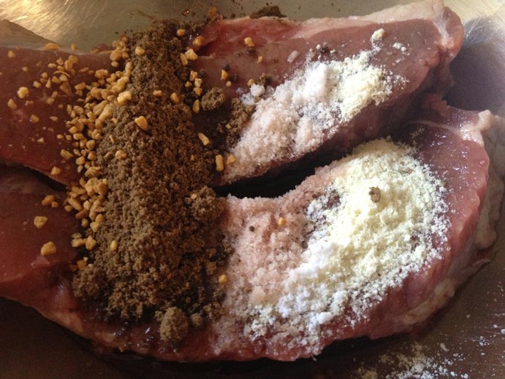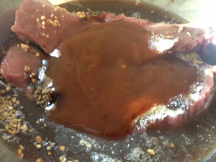 Retire qualquer excesso de gordura da carne, e acrescente uma colher de chá de tempero amaciante de carne, uma colher de sopa de sal, uma colher de açúcar mascavo, uma colher de chá de alho já frito ou amassado.