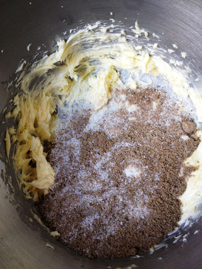 Combine 1/2 colher de chá de bicarbonato de sódio, uma xícara de cacau em pó e 1/2 colher de chá de sal. Incorpore à mistura aos poucos.