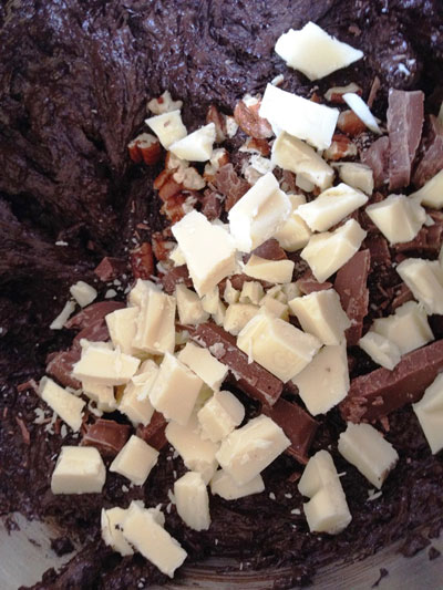 Por último, acrescente 1/2 xícara de nozes e uma xícara de chocolate picado – faça um mix de chocolate ao leite, meio amargo e branco.