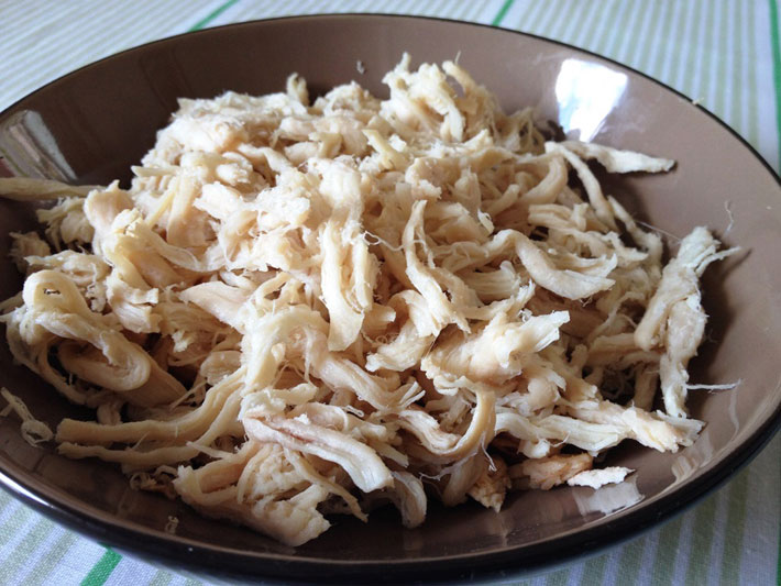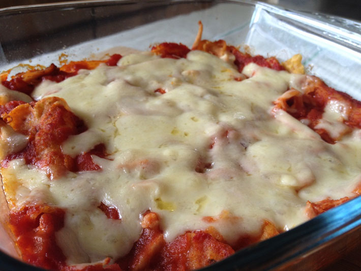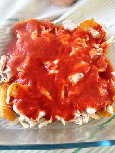 Para a montagem, forre o fundo de um refratário com 100 gramas de tortilhas de milho. Depois, metade do peito de frango desfiado. Cubra com 100 gramas de iogurte e por cima metade do molho de tomate. Por último, use metade do queijo mozarela.
