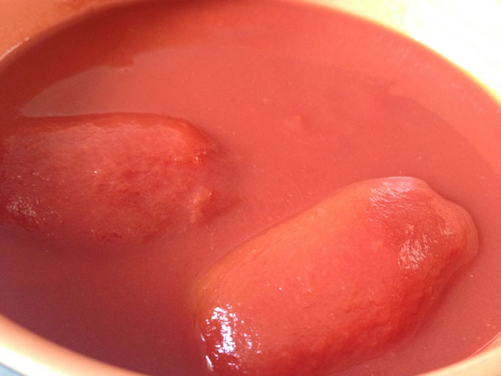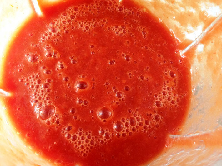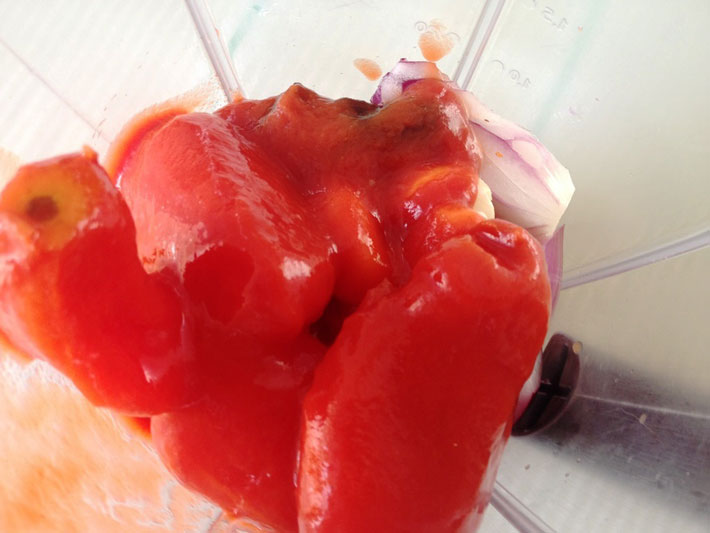 Acrescente uma lata de tomate pelado e bata tudo até obter um molho homogêneo. Reserve.