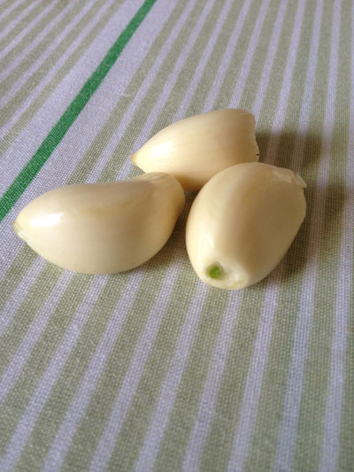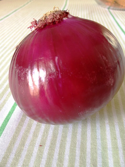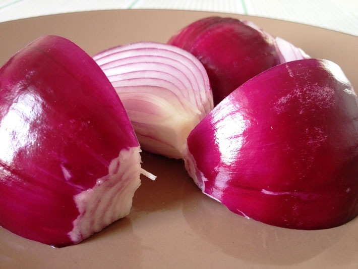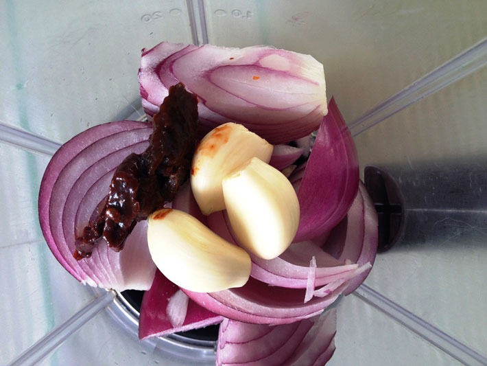 Descasque uma cebola roxa e pique-a grosseiramente. No copo do liquidificador, coloque a cebola, três dentes de alho e pimenta a gosto.