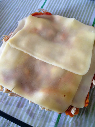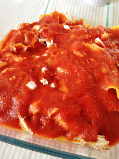 Repita os ingredientes: Tortilha. Frango. Iogurte. Molho de tomate. Queijo.