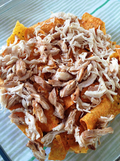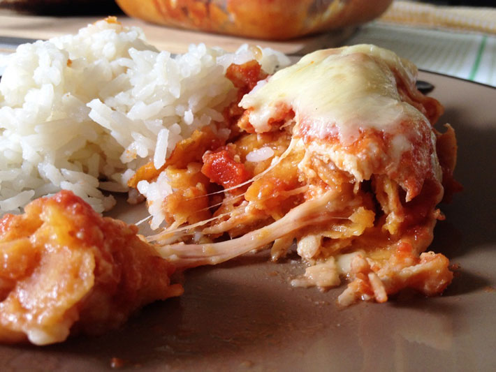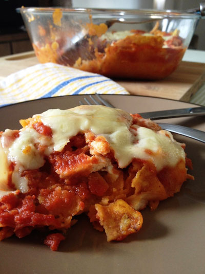 1 peito de frango desfiado 1 lata de tomate pelado 1 cebola roxa 1 colher de chá de cominho em pó 3 dentes de alho 200 ml de iogurte (desnatado ou integral) 150 gramas de queijo mozarela 200 gramas de tortilhas chip de milho sabor queijo nacho 1 colher de sopa de óleo Pimenta a gosto Descasque uma cebola roxa e pique-a grosseiramente. No copo do liquidificador, coloque a cebola, três dentes de alho e pimenta a gosto.<br>DICA: Lembre-se que os chips de tortilhas de milho já são picantes, então não exagere na pimenta. Acrescente uma lata de tomate pelado. Bata tudo até obter um molho homogêneo. Reserve. Em uma panela, aqueça uma colher de sopa de óleo. Acrescente uma colher de chá de cominho em pó. Frite por alguns segundos e coloque o molho de tomate batido. Deixe cozinhar por cerca de 5 minutos. Se ver a necessidade, acerte o sal.<br>DICA: Como depois de montada a torta ainda vai ao forno é importante não deixar o molho apurar por muito tempo para não perder muito o seu suco e acabar virando uma pasta. Pré-aqueça o forno a 180° C.<br>Para a montagem, forre o fundo de um refratário com 100 gramas de tortilhas de milho. Depois, metade do peito de frango desfiado. Cubra com 100 gramas de iogurte. Por cima metade do molho de tomate. Por último, use metade do queijo mozarela. Repita os ingredientes: Tortilha. Frango. Iogurte. Molho de tomate. Queijo. Agora é só levar ao forno para gratinar, por cerca de 20 minutos.