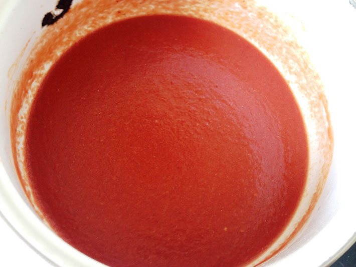 Em uma panela, aqueça uma colher de sopa de óleo e acrescente uma colher de chá de cominho em pó. Frite por alguns segundos e coloque o molho de tomate batido. Deixe cozinhar por cerca de 5 minutos. Se ver a necessidade, acerte o sal.