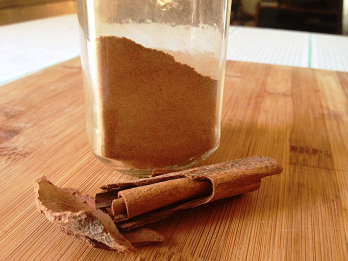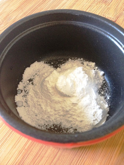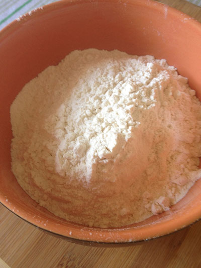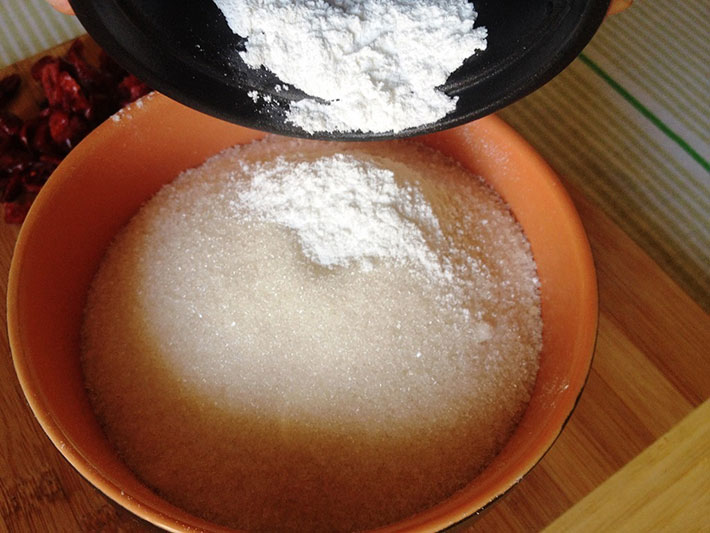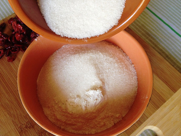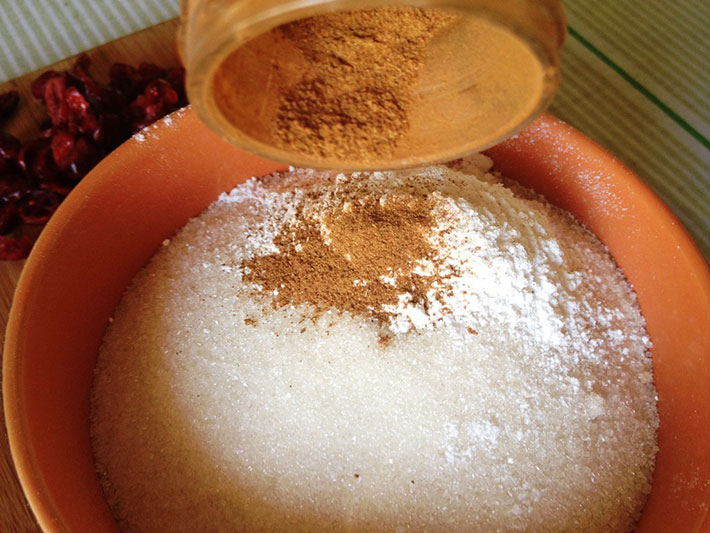 Misture os ingredientes secos: uma xícara de farinha de trigo, ½ xícara de açúcar, duas colheres de chá de fermento em pó e 1/2 colher de chá de canela em pó.
