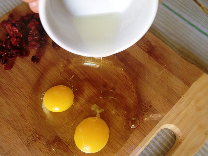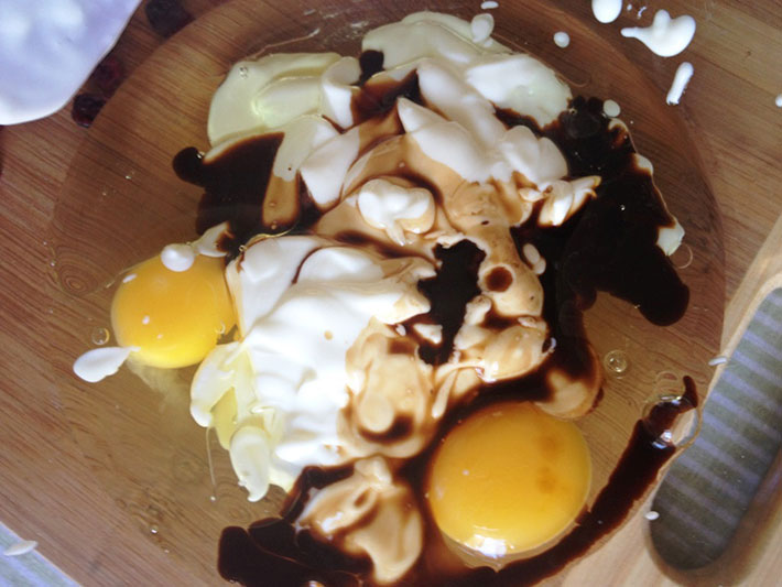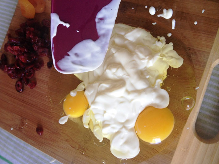 Em uma tigela separada, misture dois ovos, ¾ de xícara de iogurte grego, três colheres de sopa de óleo e duas colheres de chá de baunilha. Misture bem.
