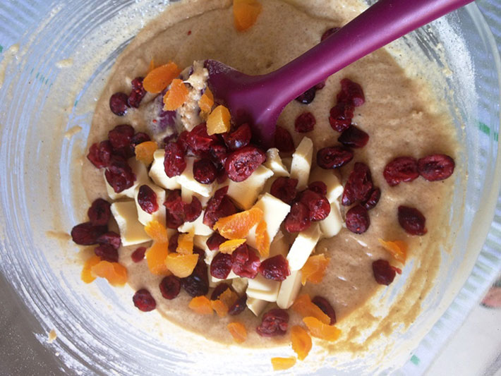 Acrescente à massa, uma xícara de chocolate branco picado e uma xícara de frutas secas a seu gosto.