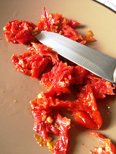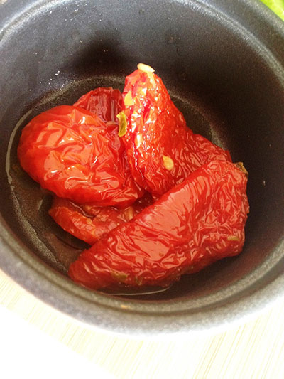 - 4 pedaços de tomates secos em óleo