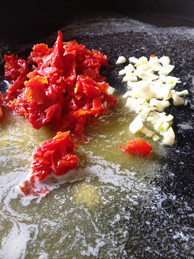 Em uma frigideira ou panela grande, aqueça uma colher de sopa de manteiga com um pouco do óleo dos tomates – cerca de uma colher de sopa também. Frite o alho e o tomate seco.