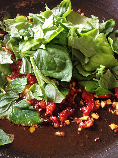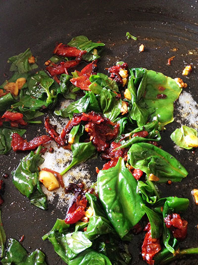 A quantidade de espinafre utilizado pode variar para o gosto de cada um. O ideal é entre um punhado bem cheio a meio maço. Retire o caule dos espinafres e rasgue as folhas. Corte uns quatro tomates secos em pedaços menores. Reserve. Depois, pique dois dentes de alho