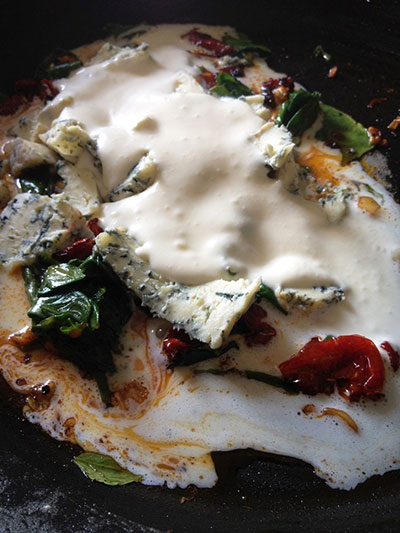 No Talharim como Molho Rápido de Queijo e Espinafre - que serve duas pessoas -, o queijo é o gorgonzola. Nessa delícia vai ainda um pouco de tomate seco.