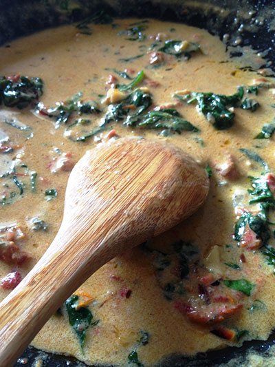 Adicione o espinafre e deixe murchar, mexendo de vez em quando. No fogo baixo, acrescente 50 gramas de queijo gorgonzola e despeje 200 ml de creme de leite.
