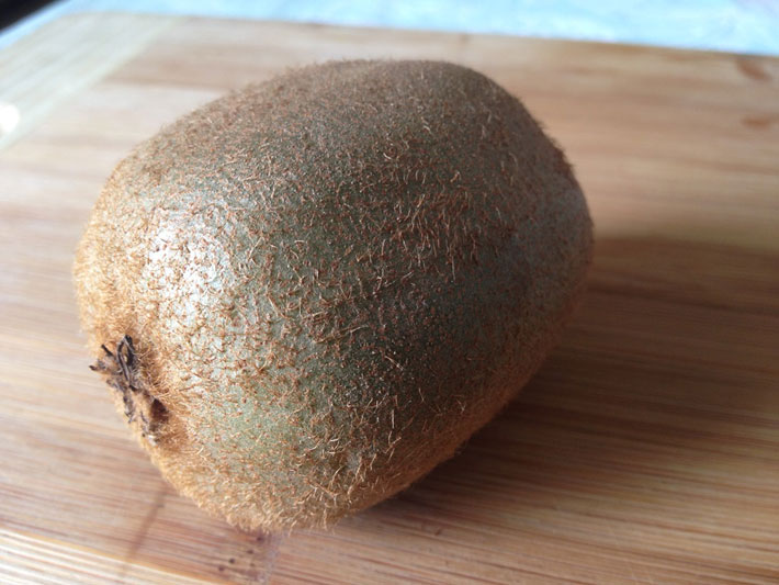 Tire a pele de um kiwi e corte em quatro partes para facilitar na hora de fazer a polpa.