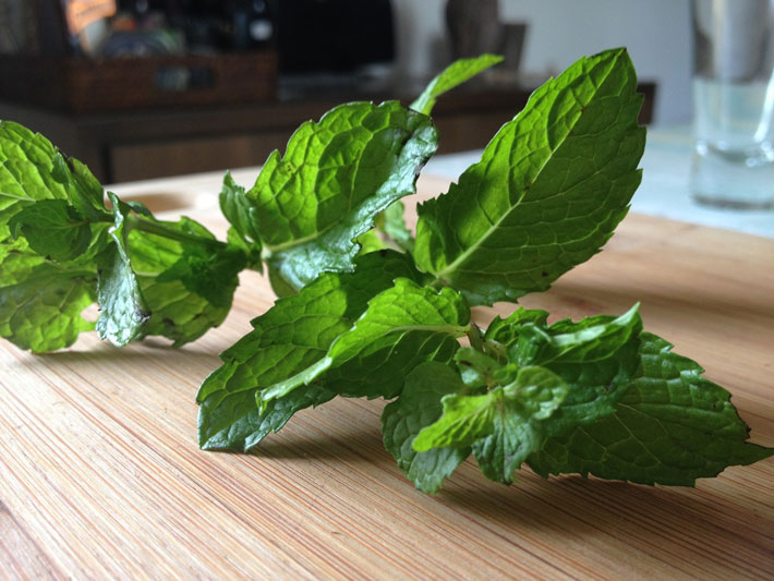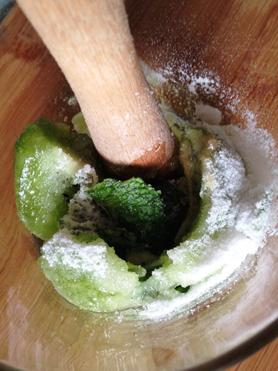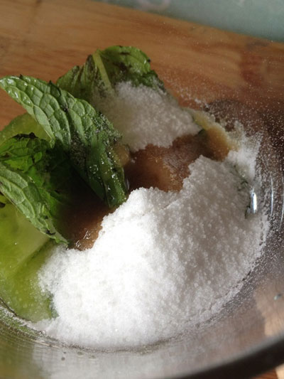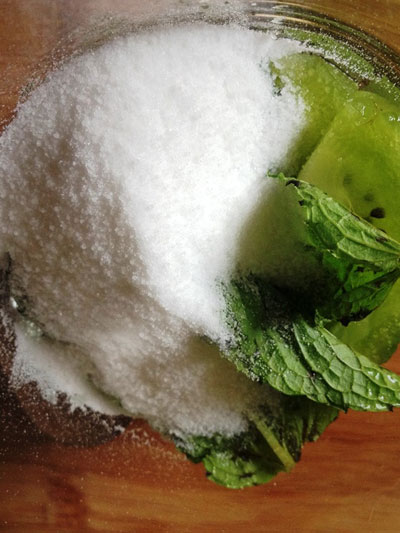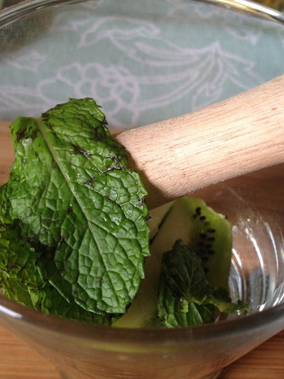 Em um copo com soquete, coloque o kiwi, as folhas de hortelã a gosto – pode usar bastante, entre 10 e 15, uma colher de sopa de açúcar e uma colher de chá de essência de baunilha.