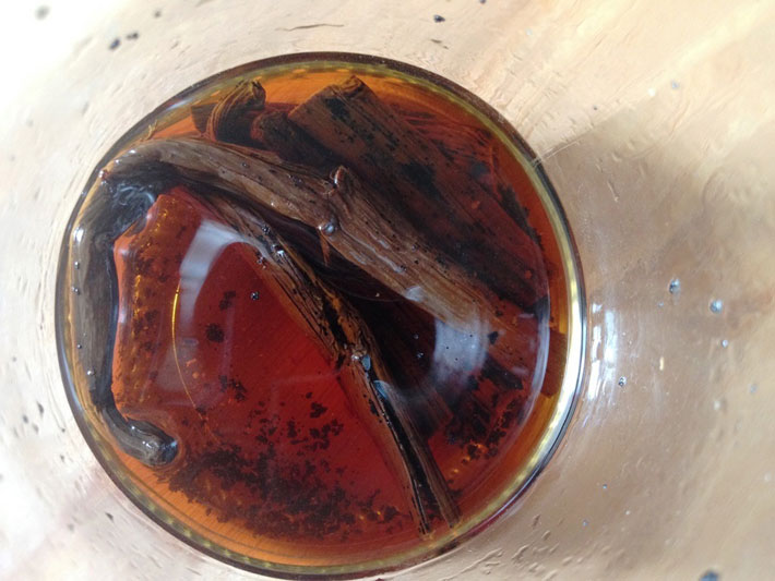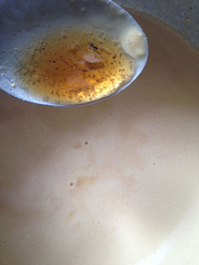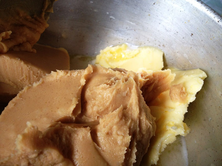 Em uma panela, derreta 100 gramas de manteiga com uma xícara de pasta ou manteiga de amendoim. Mexa até ficar homogêneo. Retire do fogo e adicione uma colher de chá de essência de baunilha. Reserve.