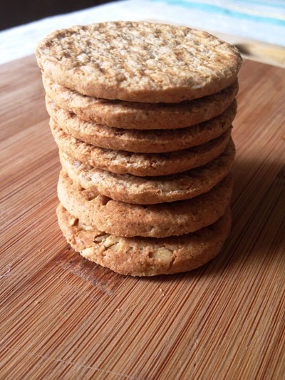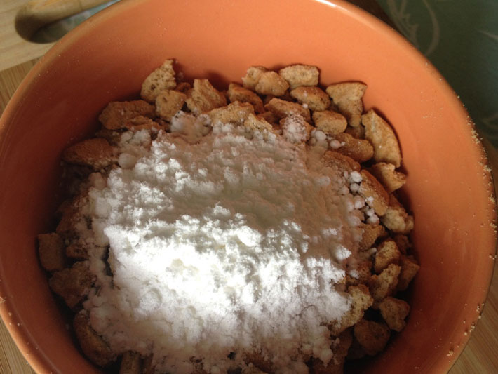 Triture grosseiramente duas xícaras de biscoito integral – nesse caso, biscoitos de cereais integrais com aveia e mel – e, em uma tigela grande, misture os biscoitos com açúcar de confeiteiro.