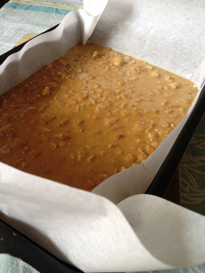 Forre um tabuleiro com papel manteiga ou filme plástico e espalhe a mistura de amendoim.