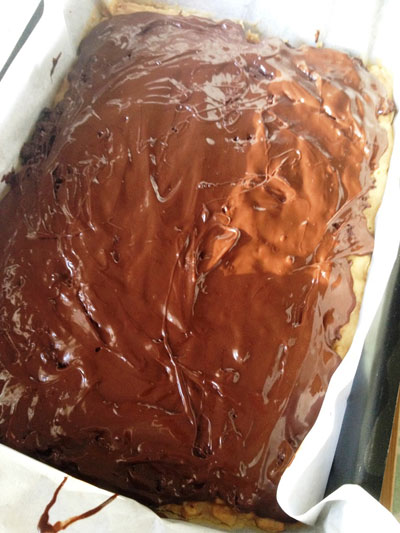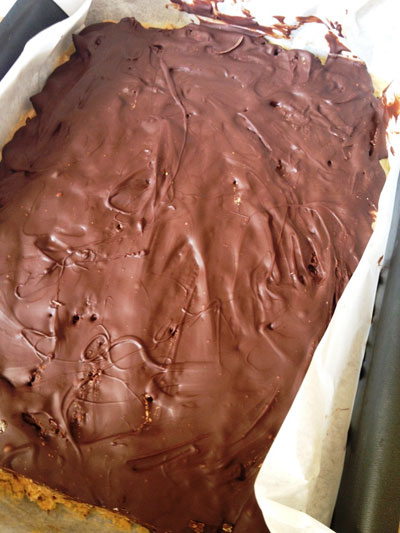 Derreta 300 gramas de chocolate meio amargo em banho-maria e, em seguida, despeje sobre a camada de amendoim.