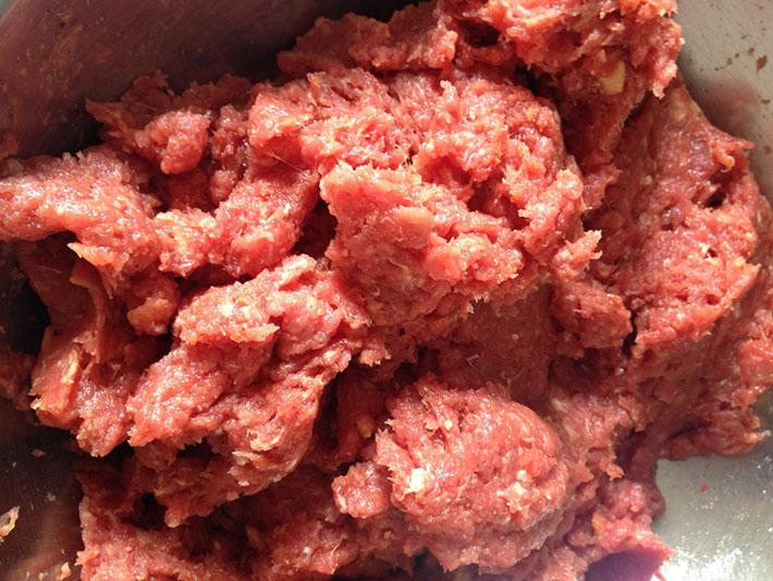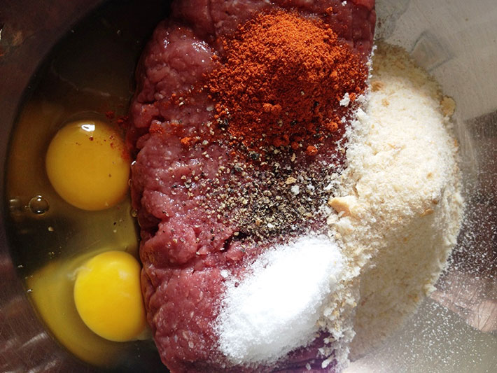 Misture 1kg de carne moída, 2 ovos, 2/3 de xícara de farinha de rosca, sal, pimenta-do-reino e páprica picante a gosto, até incorporar bem.