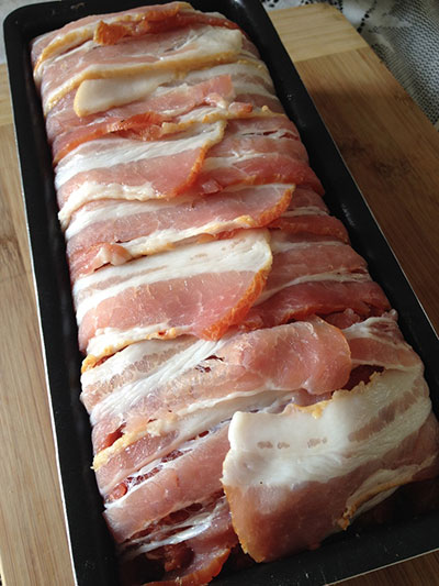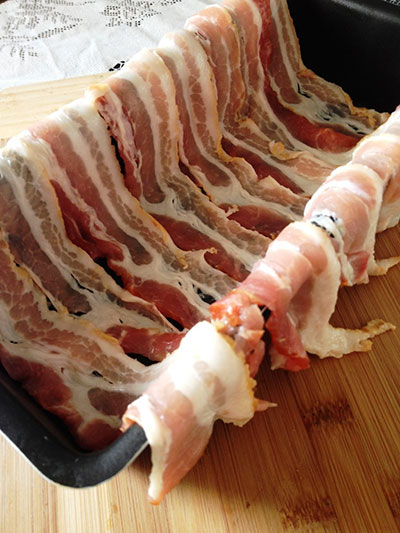 Forre uma forma de bolo inglês com 250gr de bacon fatiado, deixando as fatias penduradas para fora da forma.