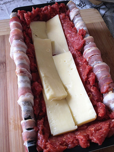 Dica: Quem não tiver a forma, pode fazer a modelagem a mão e depois enrolar o bacon. Para ajudar a manter preso, e, principalmente para assegurar de nenhum queijo acabar vazando antes da hora, use palitos de madeira ou amarre com um pedaço de barbante no final.