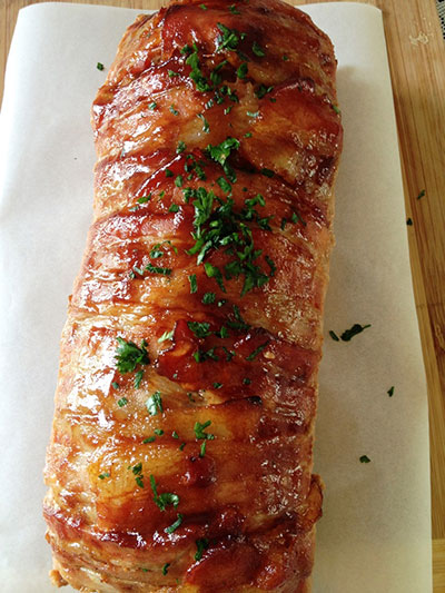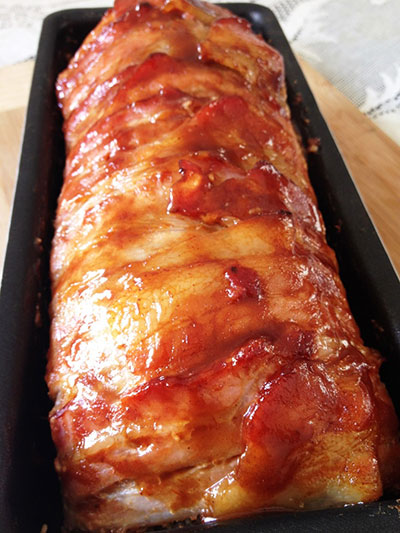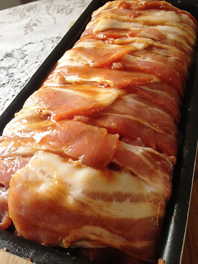 Enrole os pedaços do bacon que ficaram pendurados e pincele por cima ¼ de xícara de molho barbecue. Quem não tiver pode usar ketchup ou um molho de tomate bem encorpado.