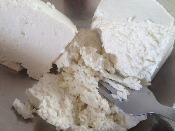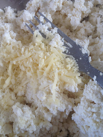 Amasse 1 xícara de ricota e misture 2 colheres de sopa de queijo parmesão ralado.