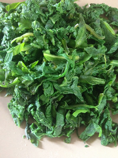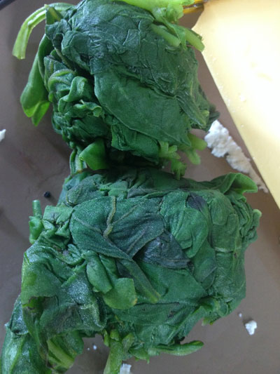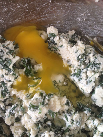 Como as folhas estarão bem quentes, deixe esfriar um pouco para fazer essa parte com as mãos. Após drenar bem o espinafre, pique e leve à ricota. Acrescente 1 ovo e misture bem.