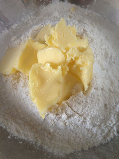 Para fazer a massa, misture 2 xícaras de farinha de trigo , 1/2 colher de chá de sal e 1/2 colher de chá de fermento em pó. Depois acrescente 100 gramas de manteiga gelada picada em pedaços menores ou em cubinhos.
