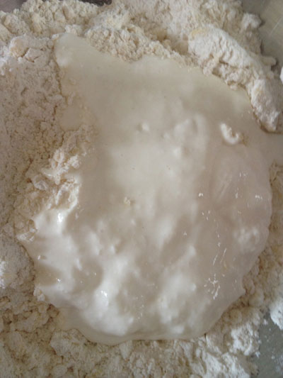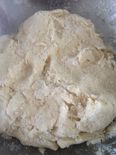 Depois que virar uma farofa, acrescente 1 caixinha de creme de leite, também gelado. Misture só até incorporar e começar a desgrudar das mãos. Não precisa trabalhar muito a massa.