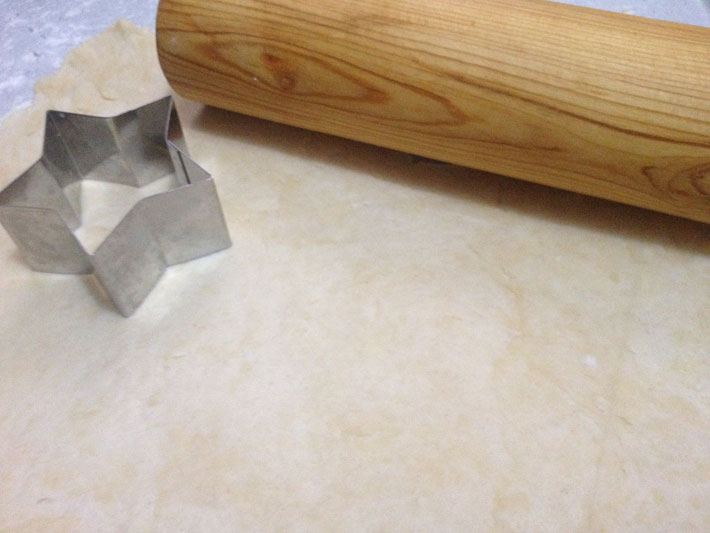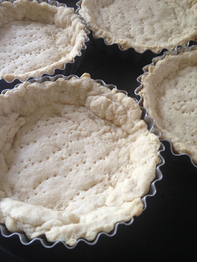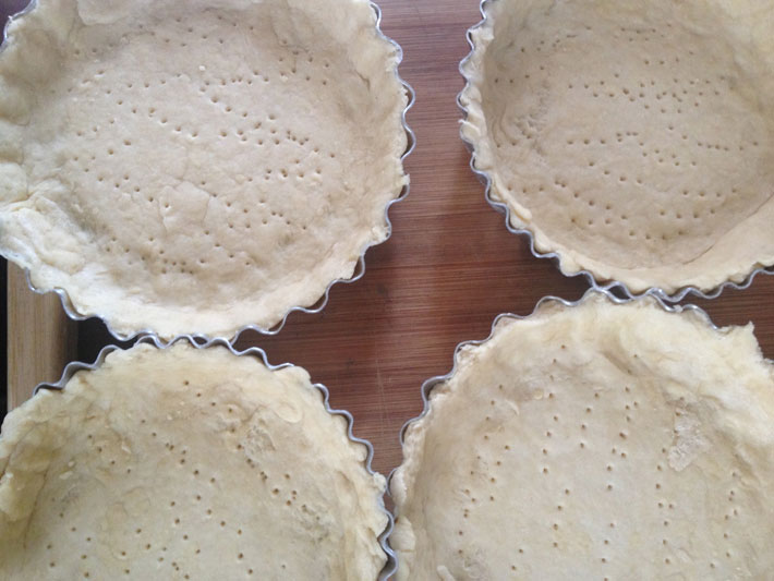 Transfira para uma superfície levemente enfarinhada e abra a massa para fazer o fundo de sua torta. Forre suas formas e, com um garfo, faça furos no fundo. Pode ser feita apenas uma torta em uma forma maior.