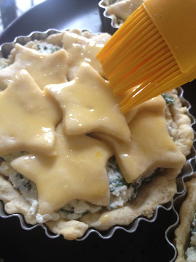 Passado os 20 minutos, recheie com o creme de ricota e espinafre e cubra com os cortes da massa e, por último, pincele com o que sobrou da gema.