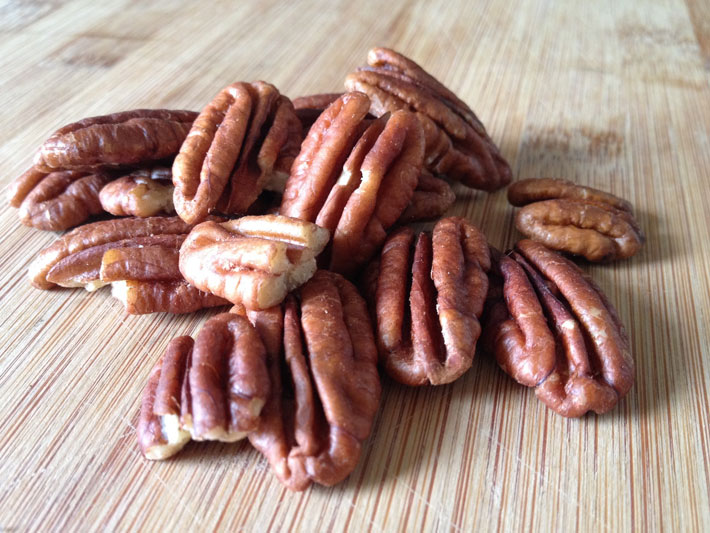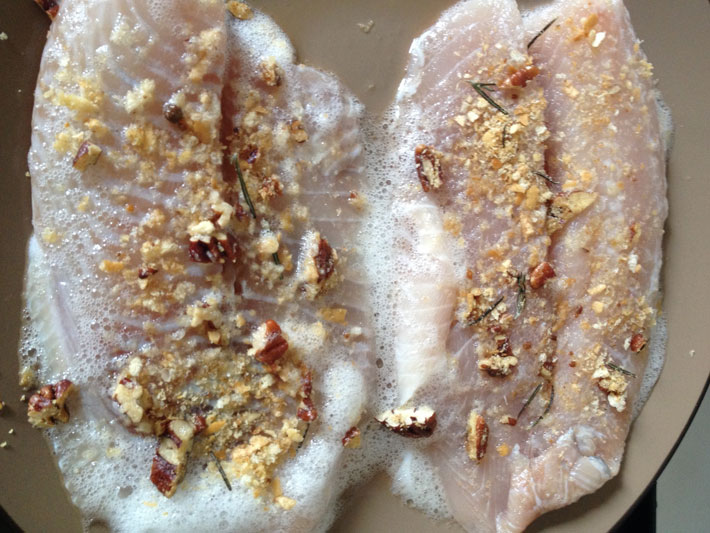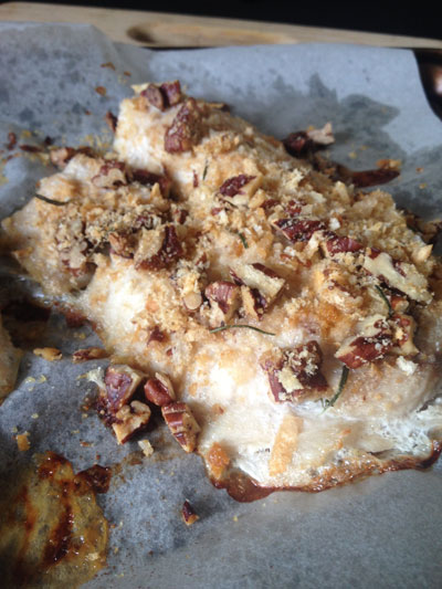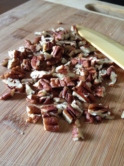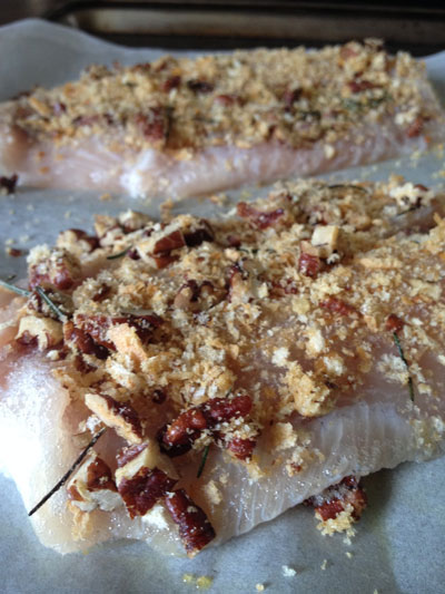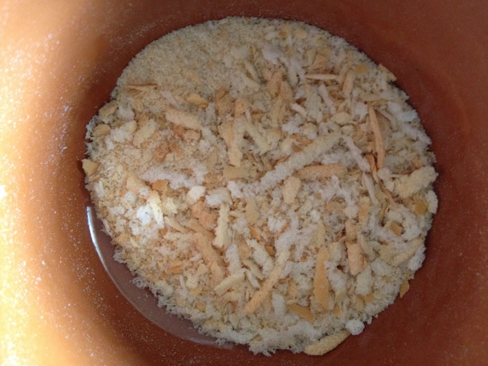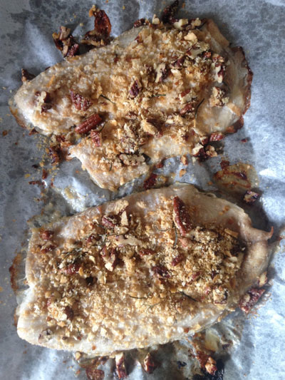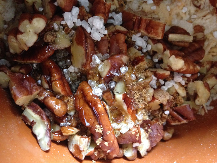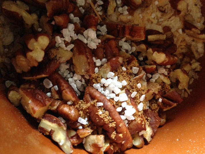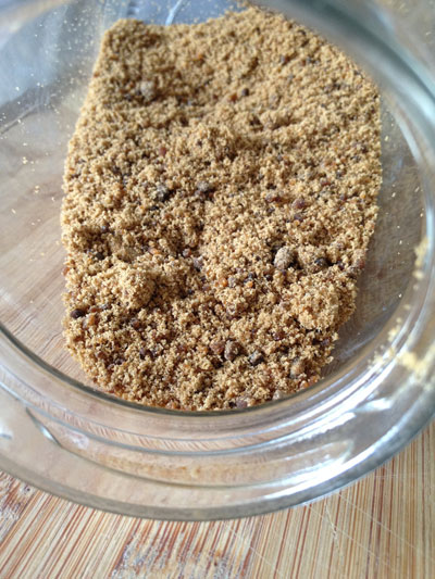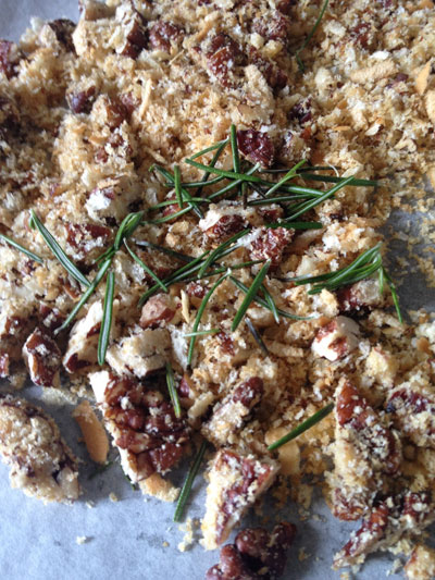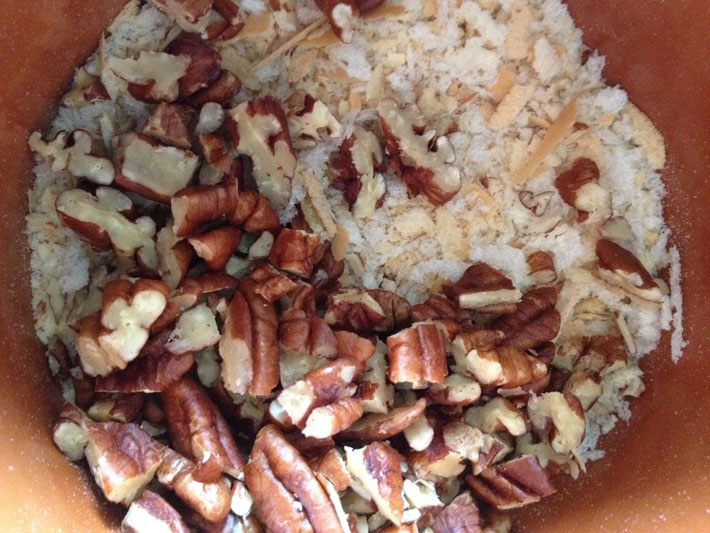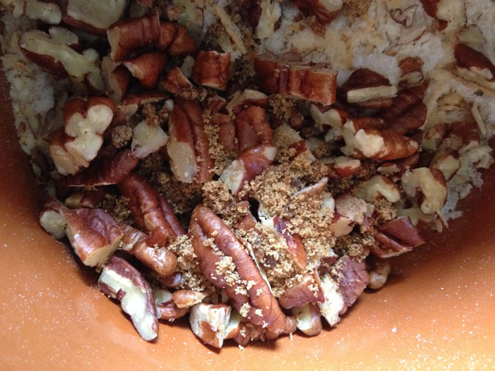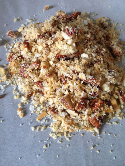 Pique grosseiramente 1⁄3 xícara de nozes e misture 1⁄3 xícara de farinha de rosca ralada grossa, ½ colher de chá de açúcar mascavo e uma pitada de sal.