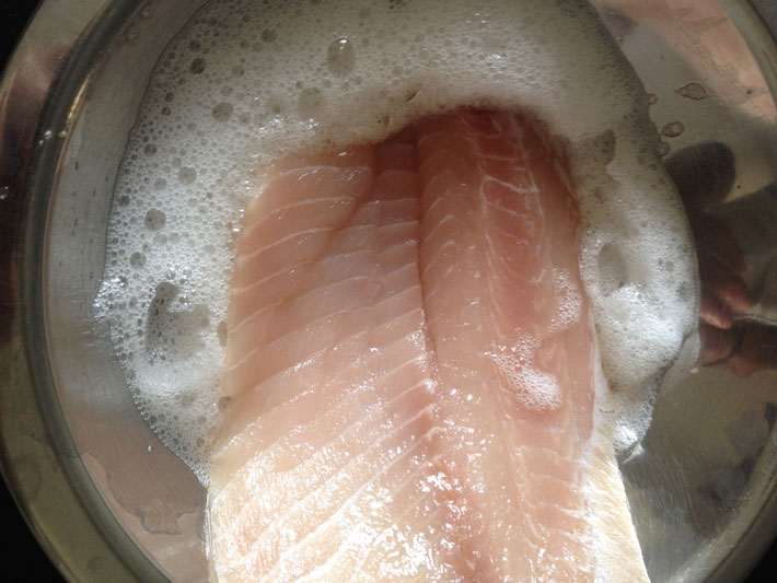 Bata 1 clara de ovo. Passe cada um dos filés na clara e depois na mistura com as nozes. Transfira para um tabuleiro untado e coloque mais da mistura por cima dos peixes, apertando levemente.