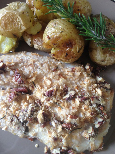 A Tilápia com crosta de Nozes e Alecrim é uma versão mais saudável do peixe empanado, já que é assada ao forno. As nozes e a farinha de rosca, quando ralada mais grossa, deixam uma crosta bem crocante por cima; O alecrim e o açúcar mascavo, por sua vez, enriquecem o peixe de sabor.