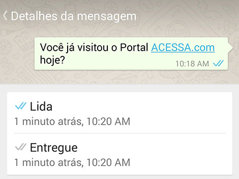 A mais recente atualização do mensageiro instantâneo mais utilizado no mundo, o WhatsApp, trouxe uma novidade que, ao mesmo tempo que era desejada por muitos usuários, promete trazer polêmica. Desde a tarde da última quarta-feira, 6 de novembro, já é possível saber quando e a hora que a mensagem foi lida pelo receptor. A mudança foi notada por usuários do app de mensagens nos sistemas Android e iOS, e ainda não está disponível em outras plataformas.